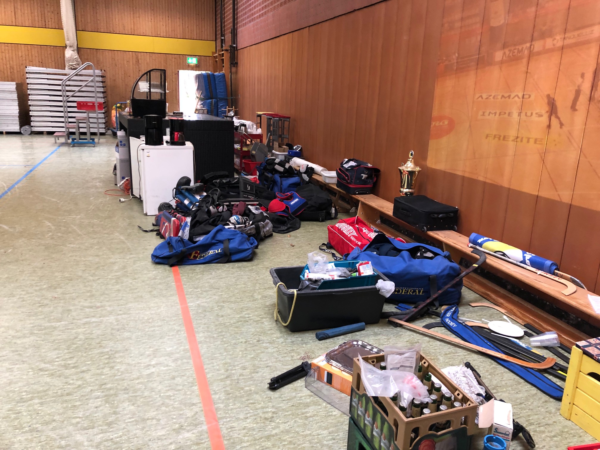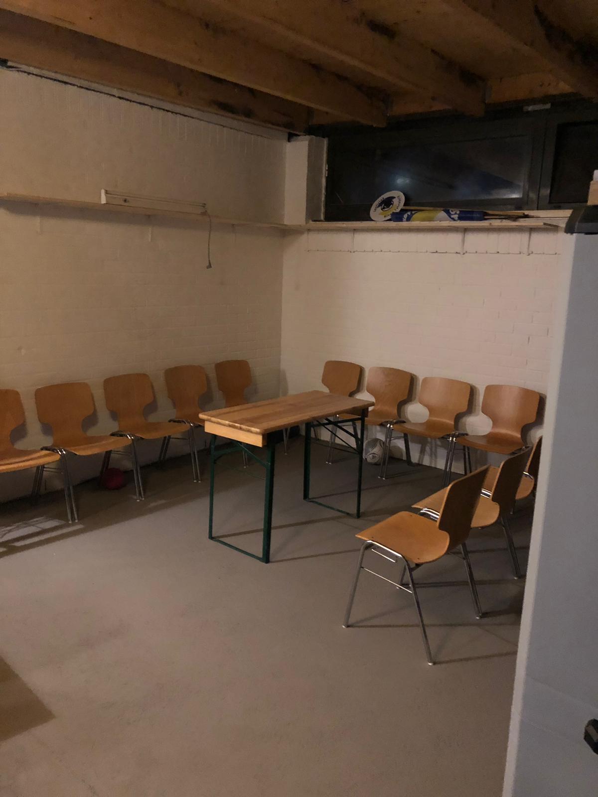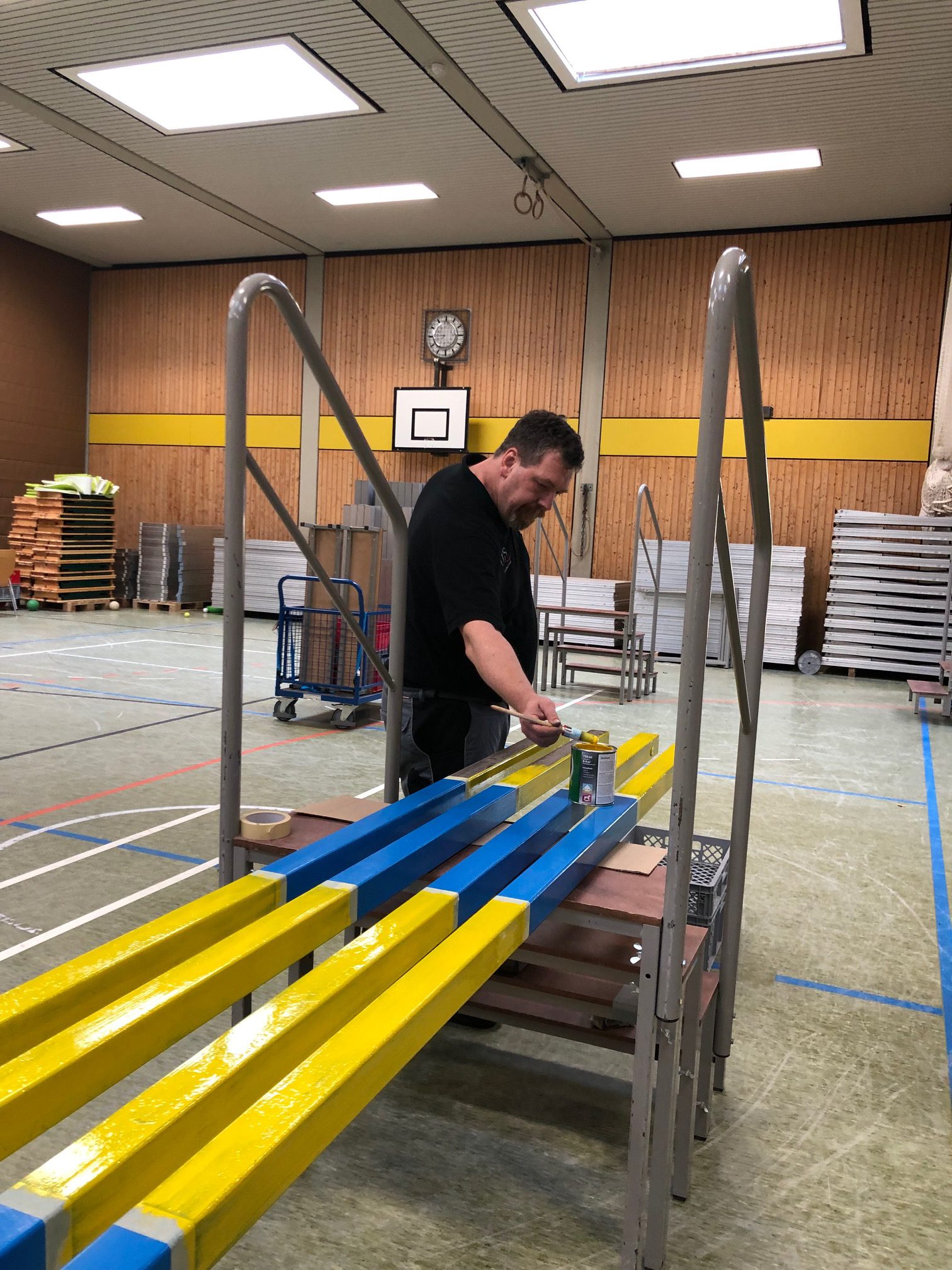 Verschiedenes «zurück zum AlbumUmbau Anbauraum Der Raum am Anfang, ein echtes Chaos!Alles in die Halle räumen.Zum Ausräumen gab es etwas WM der World-Roller-Games per Beamer.Fast ausgeräumt.Bald ist alles raus.kleinerer Anbauraum, leer mit neuer Fußbodenfarbe.Leerer Raum mit frisch gestrichenem Fussboden.Andere Perspektive.Der zweite Teil des Raumes.Das Geländer wird jetzt aufgehängt.Beim Einräumen, mehr sortiert und geordnet.Schon mal Träger für das neue Schuhregal.So könnte unsere neue Ersatz-Kabine aussehen ...Weiße Wände sehen schöner aus als Grafitti auf der alten Steinwand.Fleißig beim Streichen.Der kleine Raum wurde gestrichen und bekam Regale mit Garderobenhaken.Notkabine mit gestrichenen Wänden.Das neue Schuhregal ist fertig.Schön Rollergames schauen.Das neu gemalte Bison-Logo.Auch die Bänke wurden restauriert.Frisch abgeschliffen und beim bemalen.Neu gefärbt, schön in Vereinsfarben.Die Bänke wurden gestrichen.Die fertigen Stangen ziehen wieder nach draußen.